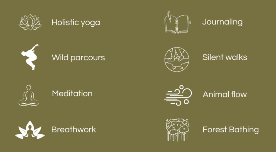 | Tuition across multiple modalities | Yoga, Wild Parcours, Forest Bathing, Breathwork and more with two experienced trainers | $3600 |
